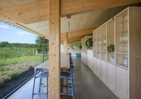 Het gebouw refereert qua vorm aan de schuren in de directe omgeving, die vaak van een aanbouw zijn voorzien. De twee volumes, met ieder hun eigen constructieprincipe, verdelen ook het programma van de groepsaccommodatie in twee delen. De gemeenschappelijke ruimte bevindt zich in het volume gericht op de bessenplantage, terwijl het andere volume de slaapvertrekken herbergt.