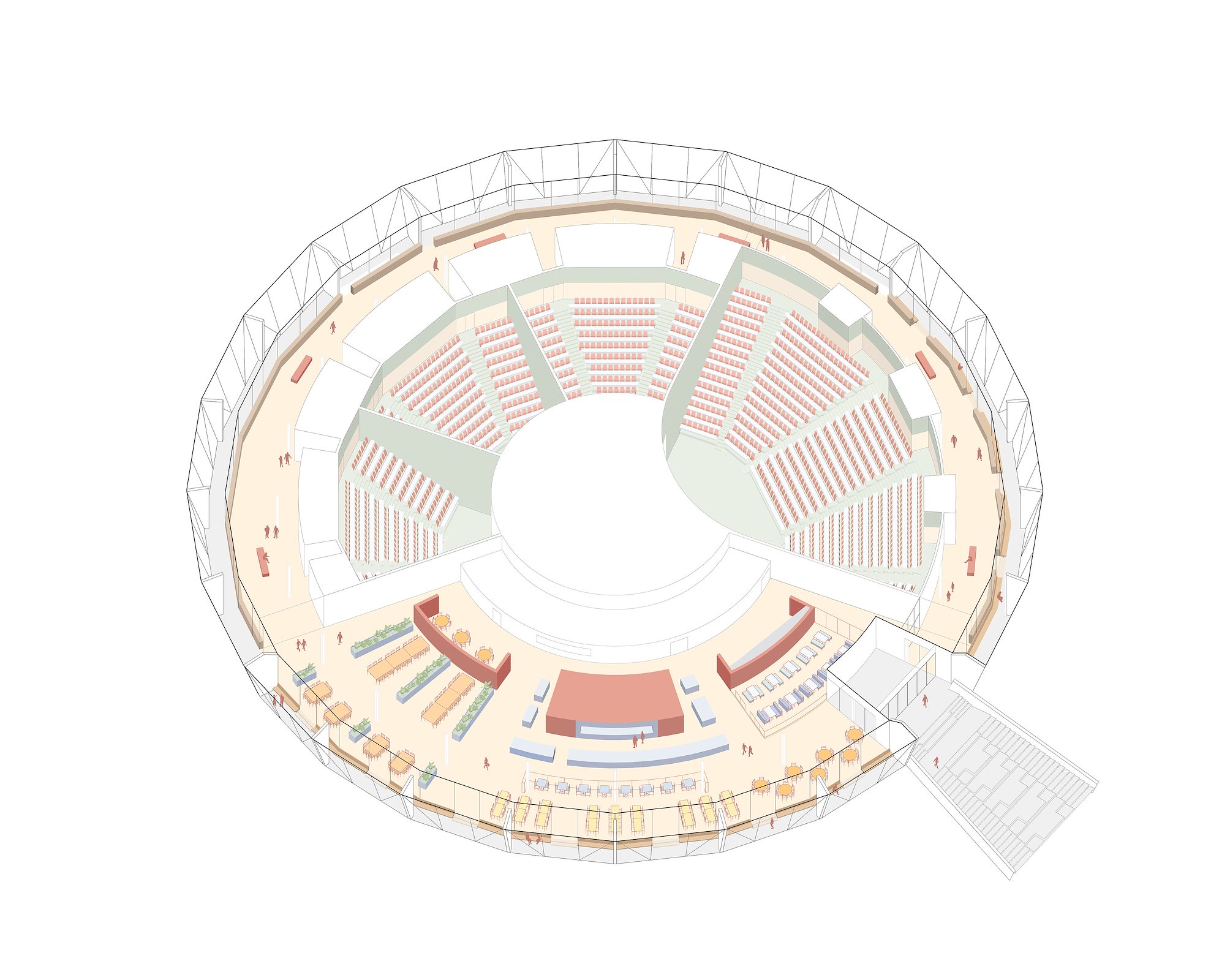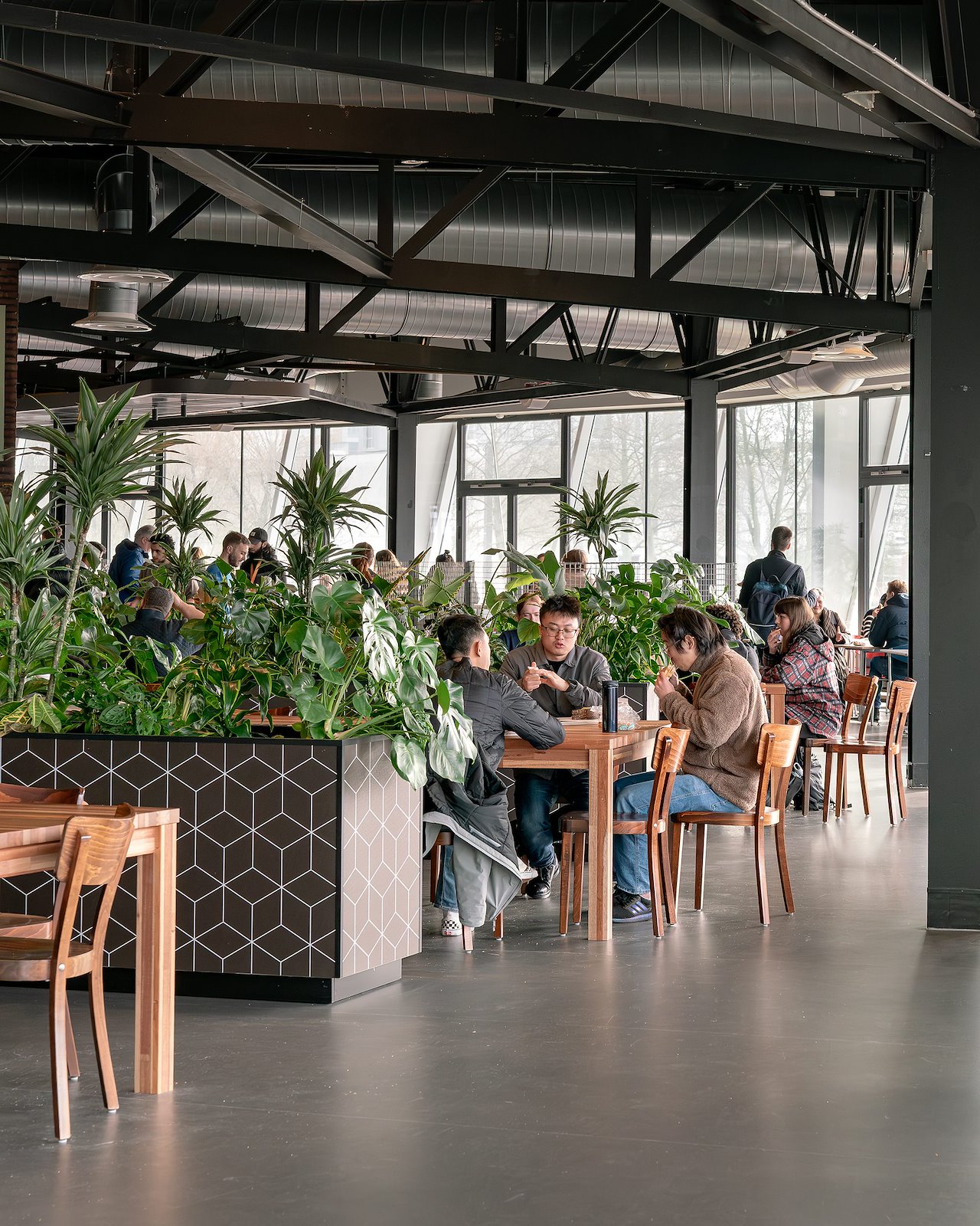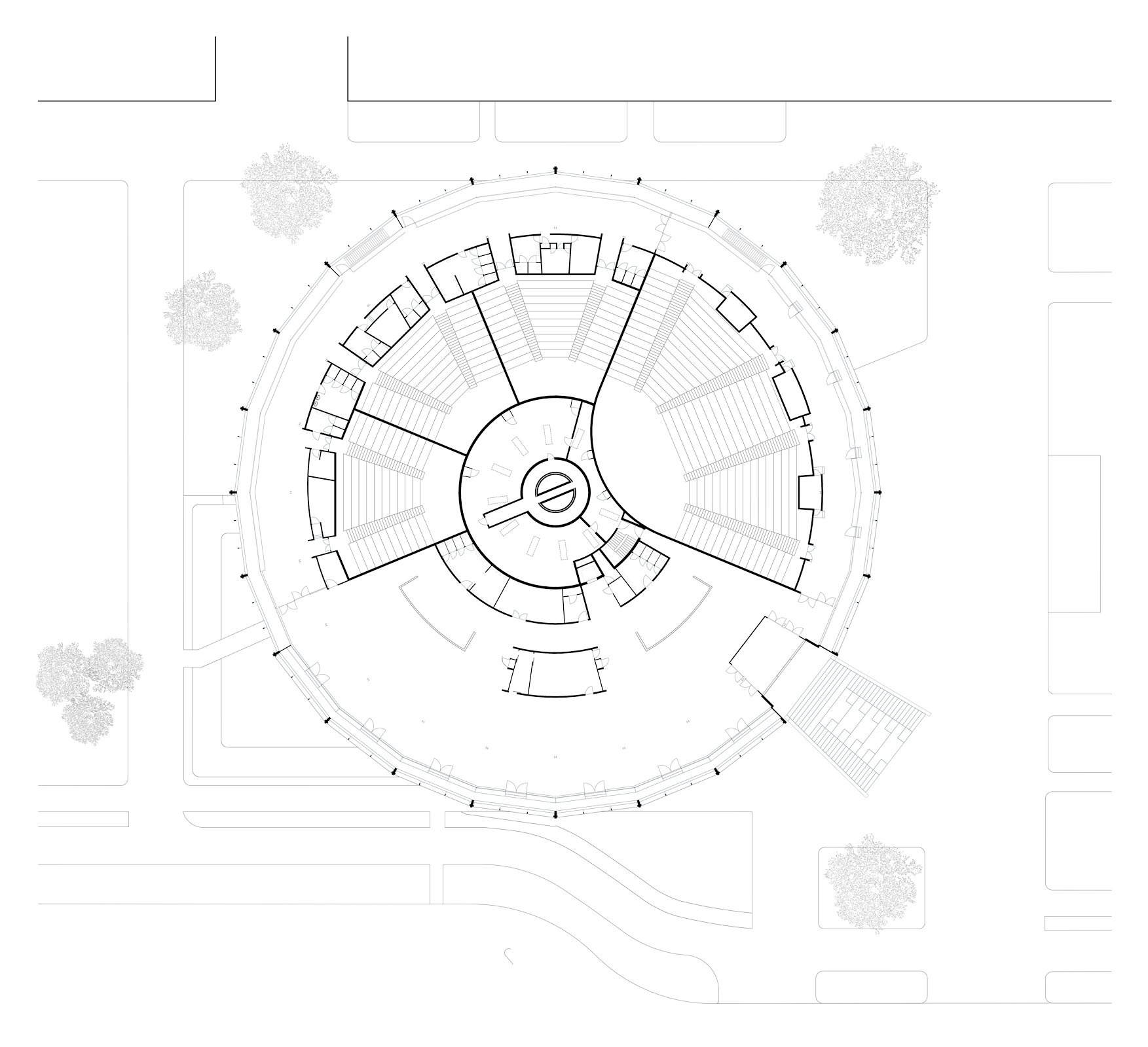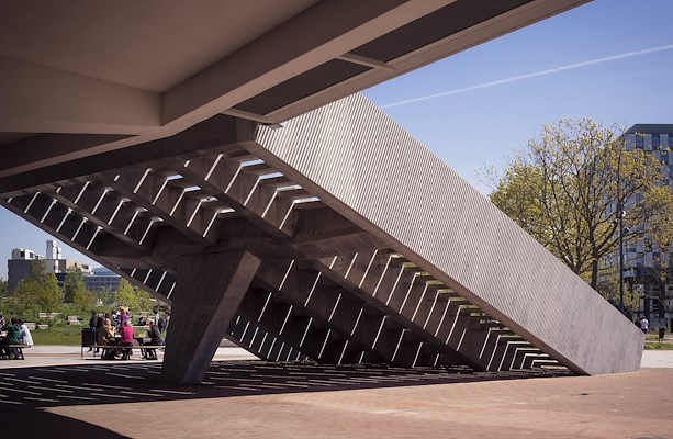 Een nieuwe trap, tevens entree, verbindt nu het maaiveld met het eerste niveau. Een bijgebouw, dat oorspronkelijke als entree fungeerde, is gesloopt. De trap leidt naar een panoramarestaurant op de eerste verdieping waar werk- en studieplekken zijn gemaakt. Dit niveau kan tevens dienst doen als ruimte voor presentaties, congressen en uitreikingen. De trap zelf in eveneens een verblijf- en ontmoetingsplek en vormt een tribune voor het campusplein.