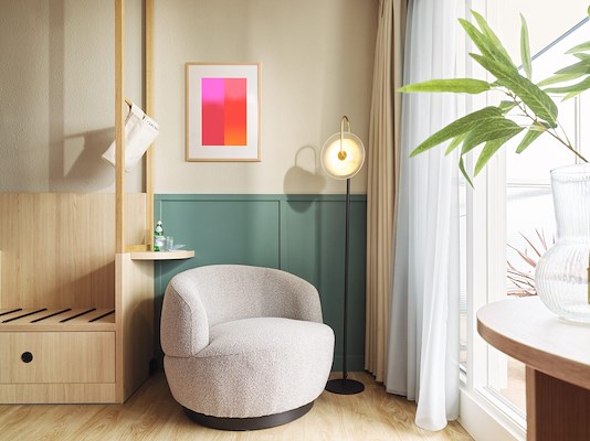 “De kamers moesten hip, hedendaags en als een thuis aanvoelen, maar mochten de vertrouwde gasten niet afschrikken. Daarom kozen we voor een tijdloze, frisse uitstraling met nostalgische knipogen in vorm- en kleurgebruik zoals zachte aardetinten en chique eik- en walnoothout”, zegt Tibo van Wayenberge van Creneau International.