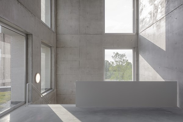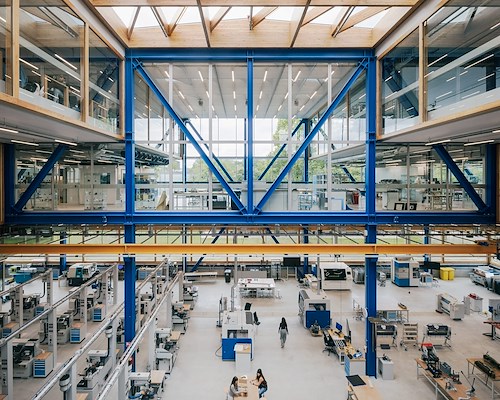 Binnen gaat de aandacht uit naar de draagconstructie die voor een kolomvrije metaal- en laswerkplaats zorgt en die twee verdiepingen met werkplaatsen erboven laat hangen. Blank houten balken, kaders en afwerkingen vormen daarbij een rustige achtergrond voor het werk dat hier gedaan wordt. Enorme raampartijen op het noorden en westen, plus een atriumdak, brengen daglicht tot diep in het gebouw. Door de begane grond iets te verdiepen was het mogelijk om een extra verdieping toe te voegen en de footprint van het gebouw compact te houden.