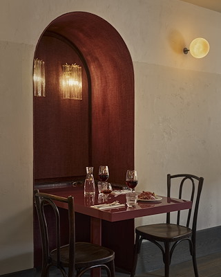 Volgens het bureau wordt er gebruik gemaakt van perspectieflijnen die worden gecreëerd door de afwerking van de muren, vloeren en plafonds. Dit leidt tot een subtiel gevoel van desoriëntatie en diepte in de hele ruimte. Pluche, fluwelen bogen en gefacetteerde spiegels moeten in het souterrain de dramatiek oproepen van backstage lounges en klassieke filmsets. In de ruimte daarboven voegt de glanzende lak van de bar een theatraal accent toe aan de architectuur van het gebouw. De wintertuin is gehuld in kamerhoge koraalkleurige gordijnen die een warme gloed verspreiden en de zachte tinten van de parasols op het terras weerspiegelen. Aan de gevel zweven bolvormige lampen boven de tafels, die voorbijgangers uitnodigen om binnen te komen.