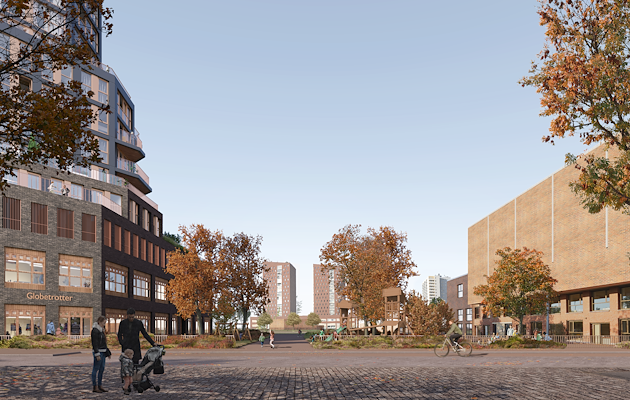 ontworpen gebouw biedt plek aan 118 woningen, een basisschool, BSO, kinderopvang en een buurtgerichte horecavoorziening. Het complex krijgt een bakstenen plint, met erboven een toren van metaal en glas.