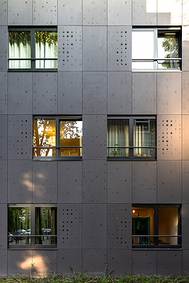 Suite 9 is gerealiseerd op een voormalige parkeerplaats aan het water langs de Balthasar van der Polweg. Het gebouw is bekleed met grafietkleurige gevelpanelen, geperforeerde panelen doorbreken het oppervlak met afwisselende patronen die de functies erachter onthullen en ‘s avonds licht laten doorschijnen.