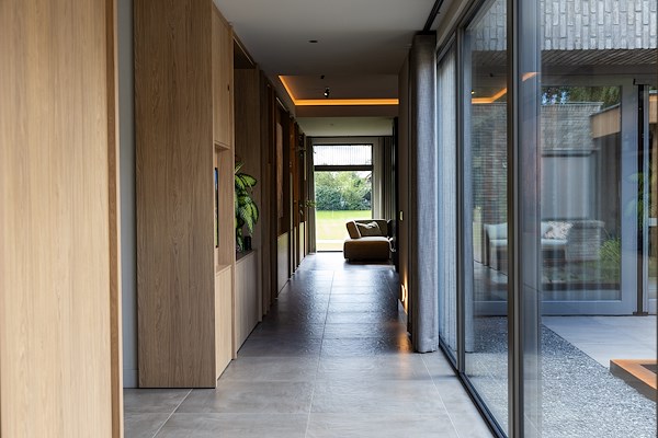 Twee van die zichtlijnen bepalen de beleving van het huis in het bijzonder. Vanaf de hoofdentree is er een visuele relatie gelegd door de patio heen naar het landschap achter de woning. Bij de tweede entree leidt een zichtlijn langs een lange eikenhouten kastenwand door de woonkamer tot aan het diepste punt van de tuin. Rondom deze assen hebben de ontwerpers de leefruimtes gesitueerd. Elk van die ruimtes biedt veel privacy, maar er is ook altijd een open connectie met het omliggende groen.