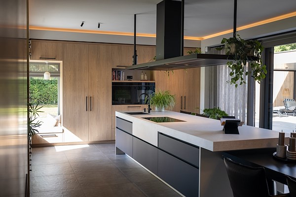 De keuken vormt het kloppend hart van het huis. Een ingebouwde bank in de achterkast biedt uitzicht op bloeiende borders. Een dubbelzijdige haard markeert de overgang tussen de keuken en de woonkamer. Zo ontstaan twee afzonderlijke leefruimtes, zonder dat er sprake is van een absolute afscheiding.De doorlopende kastenwand verbindt alle ruimtes en biedt veel opbergruimte. Het meubel kan echter ook gebruikt worden voor het uitstallen van bijzondere objecten, als of niet kunstwerken.