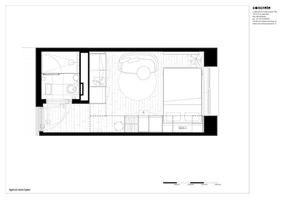 De woningen variëren in omvang van 17 tot 35 vierkante meter. Het centrale element van elke woning is een doorlopende inbouwkast die de ruimte structureert en alle essentiële functies herbergt. Keuken, bed, kasten, opbergruimte en ook de ingang van de slaapkamer zijn hierin verwerkt en met elkaar verbonden. De hal van de slaapkamer is gescheiden voor extra privacy.