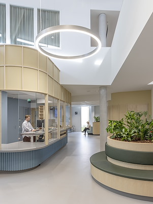 Bij het ontwerpen van het interieur zijn de herkenbaarheid voor en de zelfstandigheid van cliënt leiden geweest. Een duidelijk vormgegeven route leidt bezoekers en cliënten van het restaurant naar de verschillende behandelruimten. De overal doorgezette, identieke wandafwerking draagt bij aan de continuïteit tussen de verschillende functies en ruimtes. Met verschillende kleuraccenten zijn bijzondere plekken langs de route gemarkeerd. In het expertisecentrum is de route ontworpen rondom een patio die daglicht en oriëntatie biedt. De patio kan bovendien worden gebruikt als beweegtuin voor de fysiotherapie.