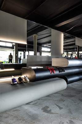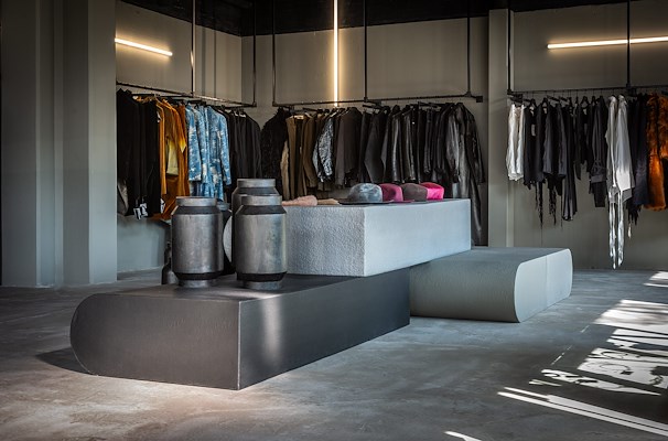, een bedrijf dat zich heeft gespecialiseerd in het transformeren van lokaal afval tot duurzaam meubilair, interieurs en bouwmaterialen voor vloeren en gevels. De modulaire objecten van Doepel Strijkers kunnen worden gebruikt als presentatieplatform, zitmeubel of als groot zitlandschap voor evenementen. De objecten spelen daarmee een sleutelrol is de gewenste flexibiliteit, inrichting en functies van de winkel.