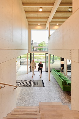 Rond dat vlonderterras heeft Marlies Rohmer verschillende gemeenschappelijke huiskamers ontworpen, net als een ruime keuken. Dat vormt het kloppend hart van Maggie’s Center Groningen. Daaromheen liggen allerlei andere ruimtes om met elkaar te praten, of je om even terug te trekken of wat te rusten. Of in het geval van kinderen even te spelen. Daarbij zit het team dat het centrum beheert strategisch op een insteekverdieping boven het hart van het gebouw.
