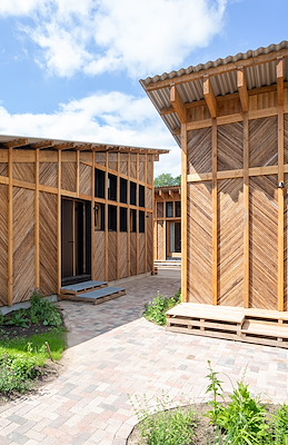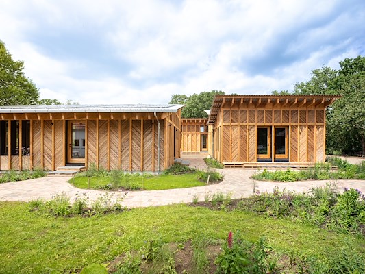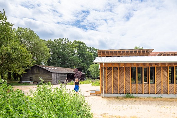 Speels ensemble van biobased gebouwen op plek oude ligboxenstal