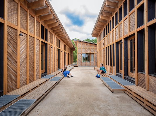 In de gebouwen is 160 m³ lokaal geoogst douglashout verwerkt, afkomstig van landgoed Slangenburg van Staatsbosbeheer, waar The Place to Be gehuisvest is. De bomen, die sowieso gerooid zouden worden, zijn in een nabije houtzagerij verzaagd tot het dragende gebint en wandafwerking voor de gebouwen.