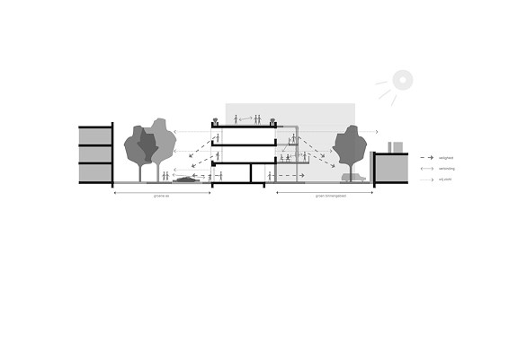 , bestaat uit verschillende typen appartementen. In het ontwerp is veel aandacht besteed aan de relatie met de omgeving en voorwaarden scheppen voor sociale ontmoeting.