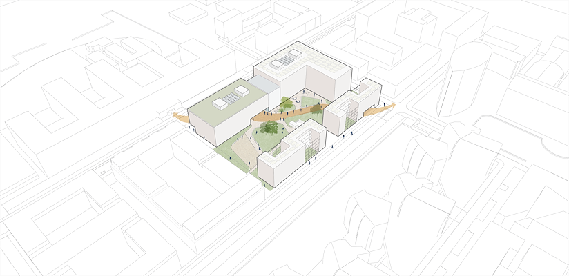 een integraal plan met een aantal gebouwen rondom een publiek toegankelijke groene buitenruimte.