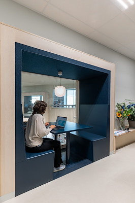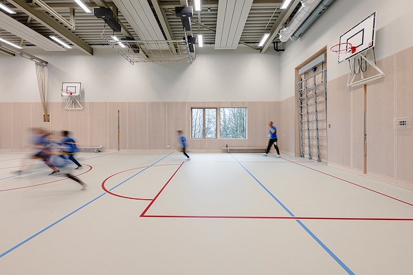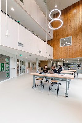 Het eerstgenoemde gedeelte verbindt met een tribunetrap de verschillende afdelingen en verdiepingen en werkt als het hart van de school. De centrale ruimte geeft het gebouw een heldere structuur en biedt tegelijkertijd ruimte voor vernieuwende onderwijsvormen, stelt atelier PRO. In de Makerspace, die in open verbinding staat met de