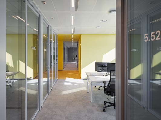 “Naast kantoorruimtes integreerden we ook electrolabs in het gebouw. Deze labs, die eerder elders gehuisvest waren, vragen om specifieke voorzieningen zoals een robuuste elektronische infrastructuur. We ontwierpen ze flexibel, zodat proefopstellingen eenvoudig kunnen worden ingebracht, aangepast en weer verwijderd”, meldt Hollandse Nieuwe.