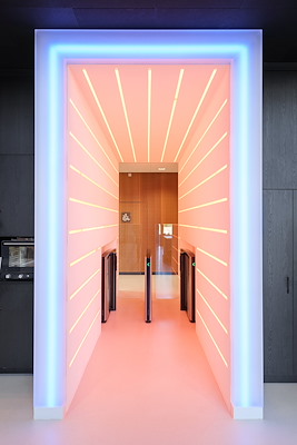 Deze kleuren vormen een samenhangend palet en sluiten aan bij de gewenste hightechuitstraling, meldt Hollandse Nieuwe. Naast dat de verdiepingen hun eigen hoofdkleur hebben , markeren de kleuren ook verschillende functies die op alle verdiepingen gelijk zijn: zo is de entree lichtblauw en zijn de touchdown-plekken helder geel. Deze ‘colorblocks’ vormen telkens het hart van elke verdieping, waardoor de routing intuïtief en herkenbaar wordt en helpen bij de oriëntatie op een vloer, verklaart Hollandse Nieuwe.