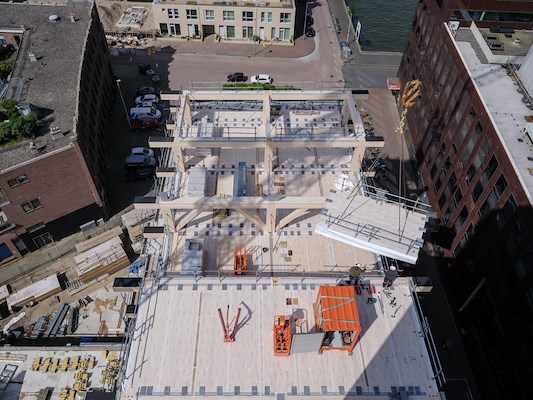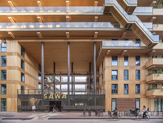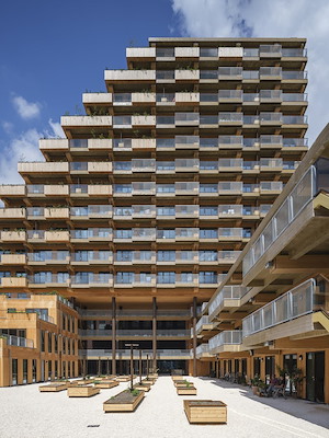Om de klimaatverandering tegen te gaan, moeten we CO2-arm gaan bouwen, benadrukt Mei, en bouwen in hout draagt daaraan bij. Bovendien slaat het ook nog CO2 op. “Daarnaast is het lichter, sneller en herbruikbaar, en zorgt het zichtbaar laten van het hout voor een warme, gezonde woonomgeving.”