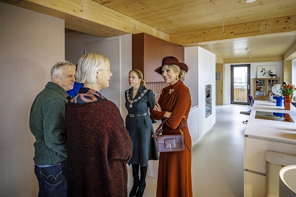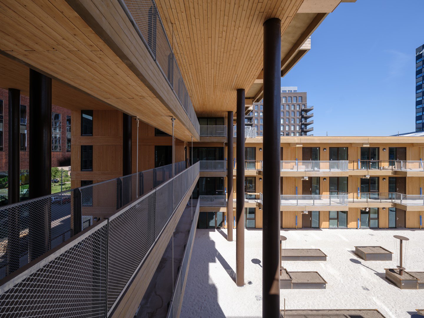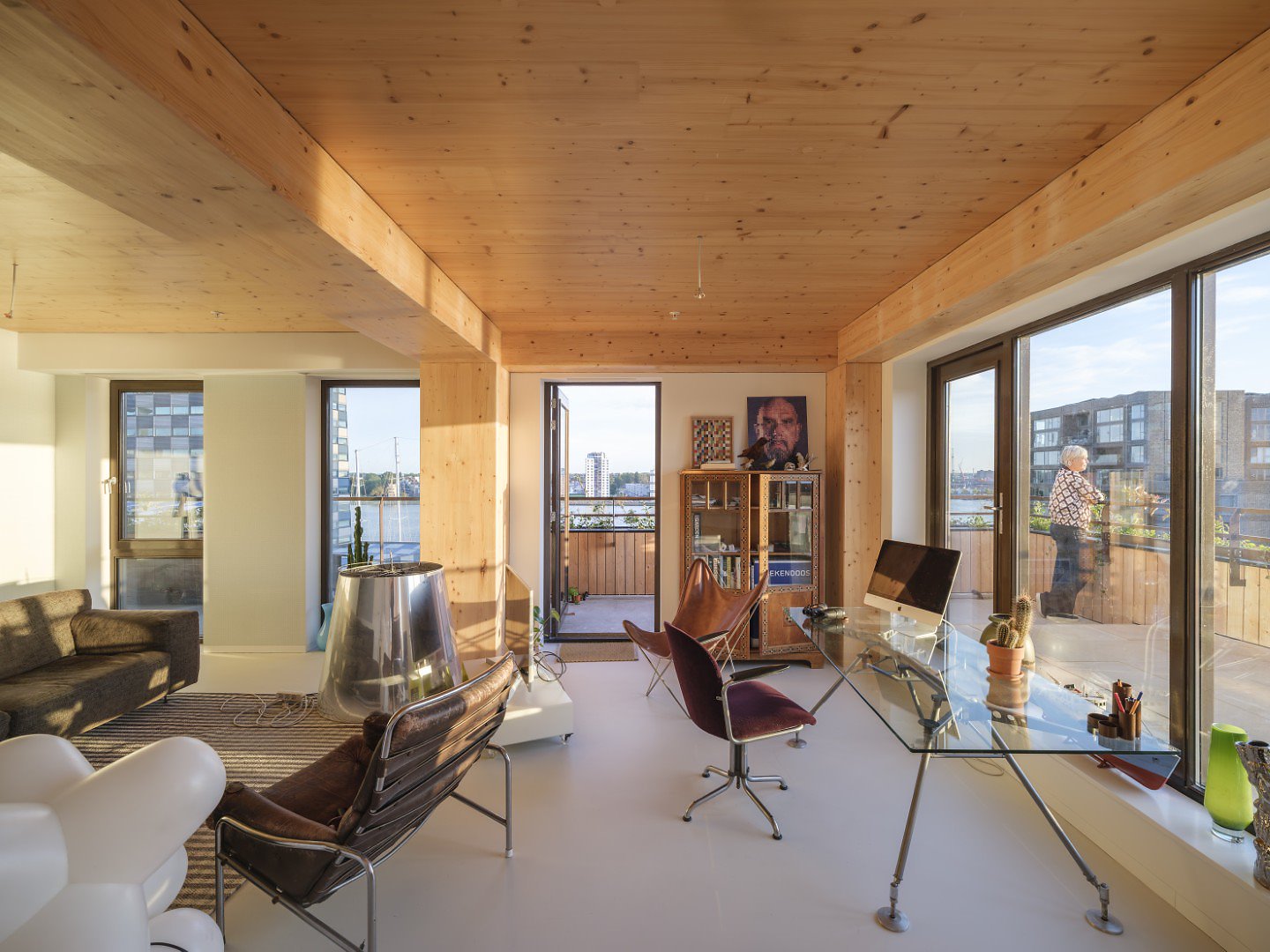Iets anders waar Mei trots op is, is dat het gelukt is om het hout grotendeels in het zicht te laten: in de woningen, op de galerijen en op de balkons. Alleen functionele ruimtes als bergingen, toiletten en badkamers zijn afgewerkt met gips.