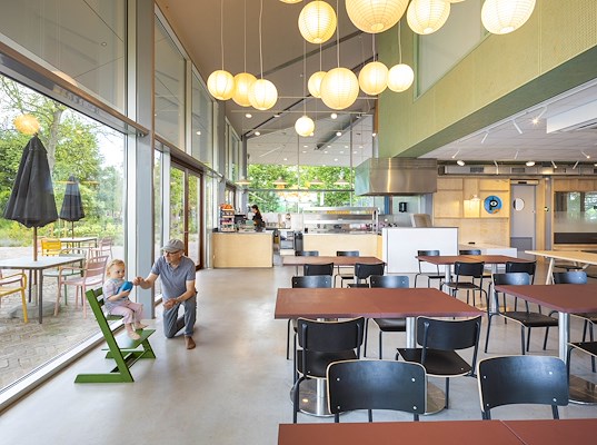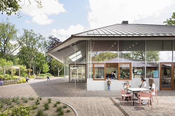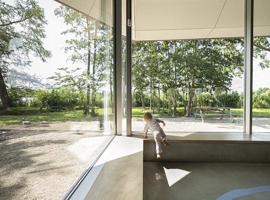 “De grootste volumes, met daarin de speelruimte en het restaurant, zijn zo transparant mogelijk vormgegeven om vrij zicht te bieden op de plas. Het gebouw heeft royale ramen, talrijke deuren en overstekken die de binnen-buitenrelatie versterken en zorgen voor een alzijdige oriëntatie.”