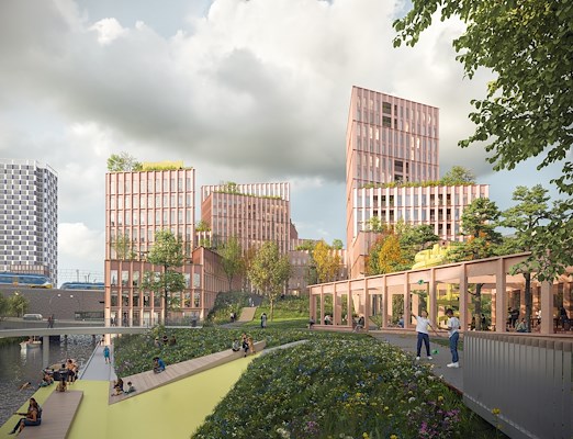 nieuwe beelden van de invulling van het Smakkelaarsveld. Op de locatie direct naast Utrecht Centraal en Hoog Catharijne komen twee woongebouwen met koop- en sociale huurwoningen, een kantoorgebouw, een stadspark met horeca en een haventje aan de Leidse Rijn. Het project is ontworpen door Studioninedots, samen met onder andere ZUS, Arup en VDNDP.