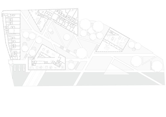 “In het hart van het park hebben we het Theehuis toegevoegd: een paviljoen met een horeca en een open ruimte omringd door een colonnade, ontworpen om uiteenlopende activiteiten en evenementen voor de stad te huisvesten. In de omringende bouwvolumes liggen aan het park werkruimtes, grondgebonden woningen, een sportschool en een ruimte voor collectieve evenementen van bewoners. Bovenop het kantoorgebouw ligt het Smakdak, een klein cafépaviljoen met een terras dat uitkijkt over de stad.”