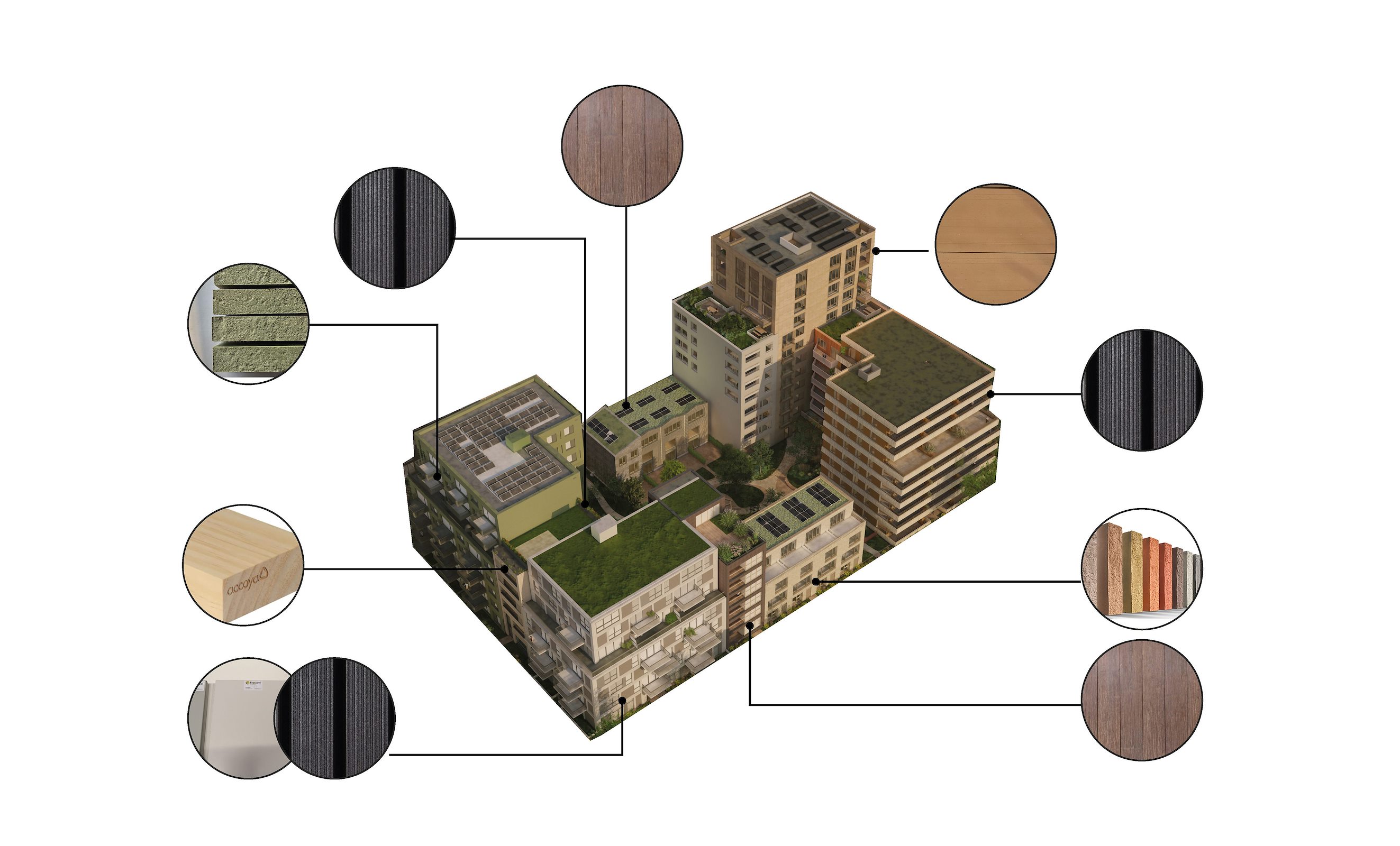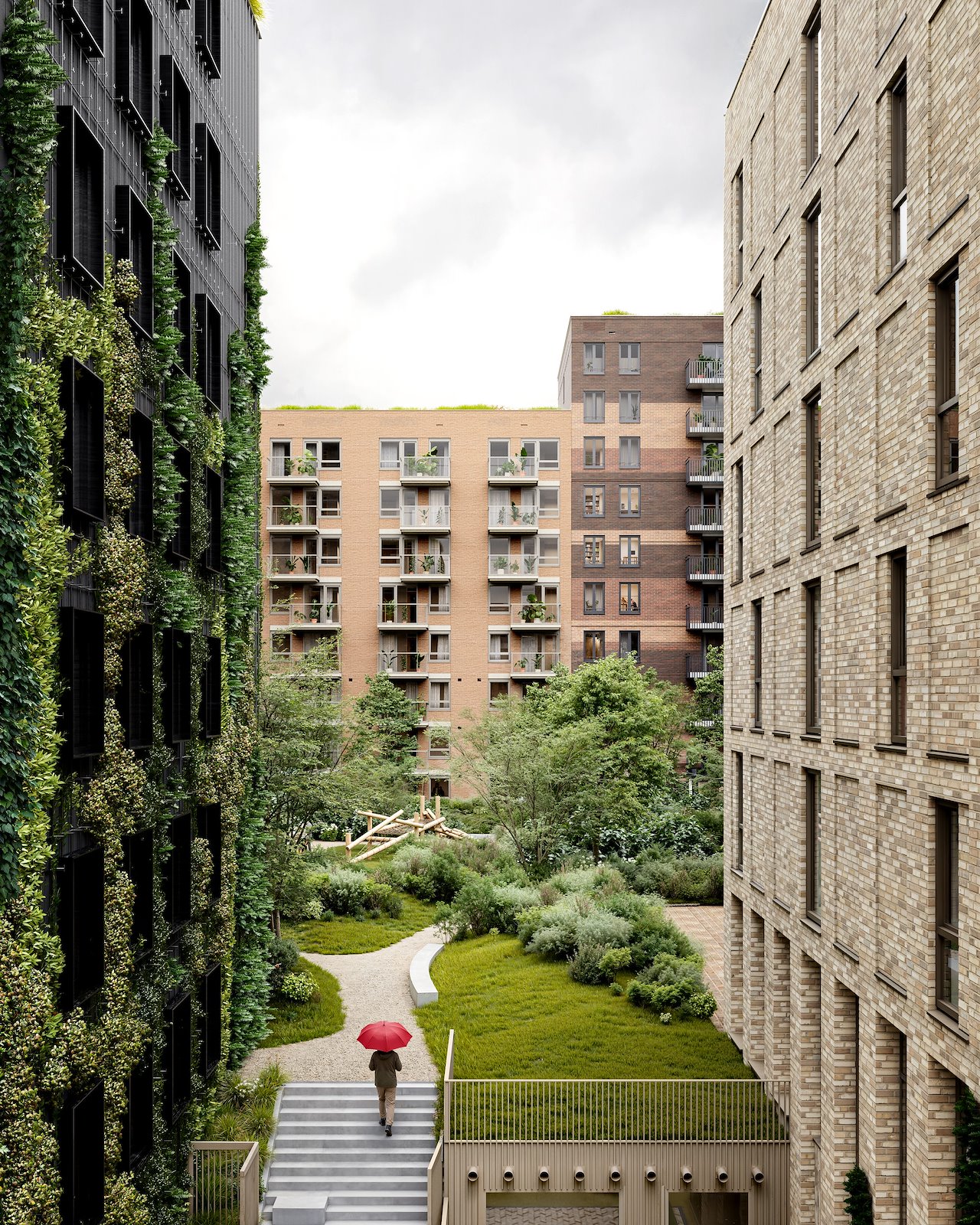 coulisse stad wordt gestreefd naar en ontworpen aan een sterk verstedelijkte wijk met respect voor de menselijke maat waarbij levendige plinten een belangrijk element zijn. Het voltooide Merwede zal in totaal meer dan 200 gebouwen gaan tellen, verdeeld over 24 stadsblokken. Daarbij wordt gestreefd naar variatie in grootte, hoogte en architectuur van de gebouwen, wat bijdraagt aan het karakter en uitstraling van een pandenstad. De blokken beginnen relatief laag aan de zijde van het kanaal en nemen in hoogte toe richting de Europalaan waar de hoogste bebouwing zal ontstaan. Door setbacks in de verschillende volumes moet een divers daklandschap en een uniek stadsbeeld gaan ontstaan. De landschappelijke inrichting en royale aanwezigheid van groen is een dominante ontwerpfactor. Dit aspect zal in een navolgend, tw