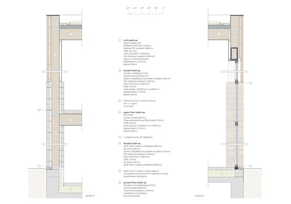 Behalve ruimtelijk heeft De Nieuwe Context ook in de materialisering van de woning de verbinding met het landschap willen leggen. Daarvoor heeft het de wanden opgebouwd uit dragende leemsteenblokken, geleverd door het Spaanse Fetdeterra. Deze aarden constructie is aangevuld met een houten constructie voor het bovenste deel van de wanden, de verdiepingsvloer en het dak. De houten buitengevel is uitgevoerd in Fraké hout.