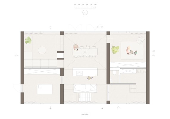 De centraal gelegen woonkeuken heeft een gelijkvloerse aansluiting op de tuin, maar de woonkamers aan weerszijden daarvan liggen iets verdiept, als zitkuilen. Tegenover het weidelandschap buiten geeft dat de woonkamers enige geborgenheid. Maar de hoogteverschillen bieden ook een net ander perspectief op buiten, brengen de natuur rond het huis dichterbij.