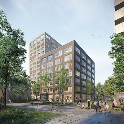 “Bovenin het hoogste woongebouw bevindt zich een ruime collectieve ruimte, met een dakterras en spectaculair panoramisch uitzicht over de omgeving”, gaat het bureau verder. “Op de begane grond ligt een flexibele lobby die kan worden ingericht voor activiteiten en evenementen. De ruimte biedt een plek voor maatschappelijk ondernemen door bewoners of in samenwerking met de buurt of nabijgelegen scholen. Daarmee kunnen de woongebouwen niet alleen waarde toevoegen voor hun bewoners, maar nadrukkelijk ook voor de omgeving, kunnen het dus goede buren zijn voor de buurt.”