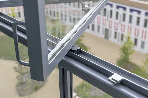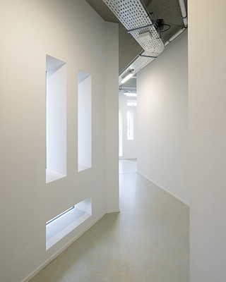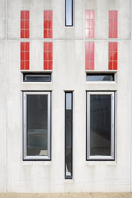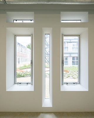 De appartementen zijn georiënteerd op de nieuwe binnentuin, een kloosterachtige ontsluitingsgang aan de buitenzijde werkt als geluidsbuffer en werpt nieuw licht op het originele ontwerp. Op basis van het ritme en de lay-out van de grafische en kleurrijke gevel werden de sleufachtige gevelopeningen paarsgewijs samengevoegd tot ventsters die voldoende daglicht binnenlaten. De zorgvuldig weggefreesde tussenpenanten laten ‘littekens’ na die de toeslag in het beton openbaren.