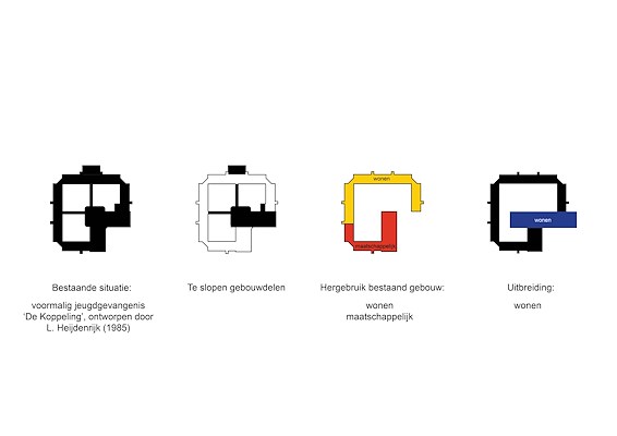 De voormalige jeugdgevangenis is oorspronkelijk ontworpen door architect Leo Heidenrijk. De dragende gevel bood volgens NL Architects verrassend veel vrijheid voor de indeling. Hoewel de oude gangen- en cellenstructuur nog herkenbaar is, hebben de architecten er een veel vriendelijker woonomgeving van gemaakt.