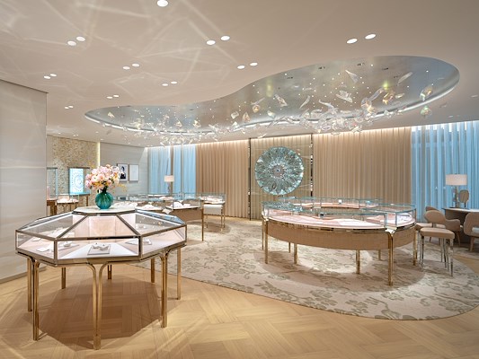 bestaat uit golvende glazen, verticaal geplaatste vinnen van gerecycled glas die lokaal geproduceerd zijn. Het ontwerp en motief zijn, net als bij de eerdere gevels voor het merk, geïnspireerd op de klassieke sieradenontwerpen van de Italiaanse sieradenontwerpster Elsa Peretti. In het bijzonder was dat het ontwerp voor de Bone Cuff-armband die Peretti ruim vijftig jaar terug in 1970 ontwierp.