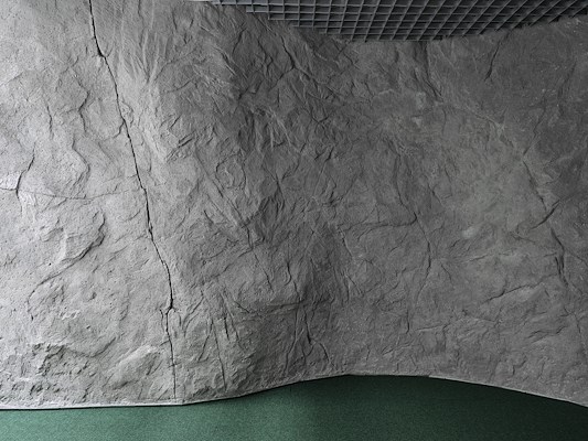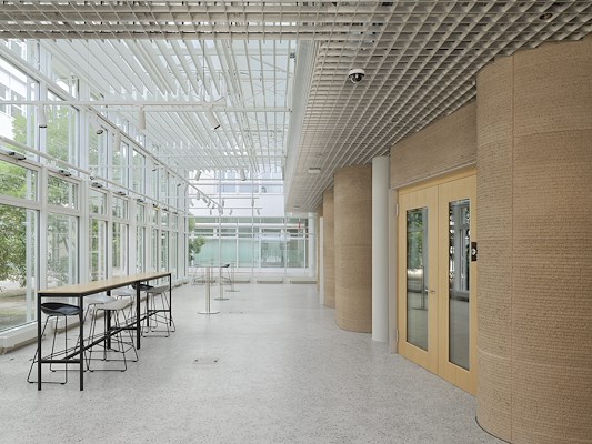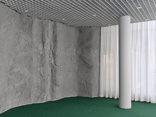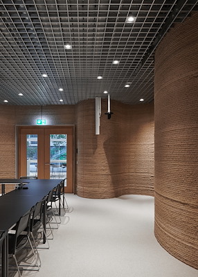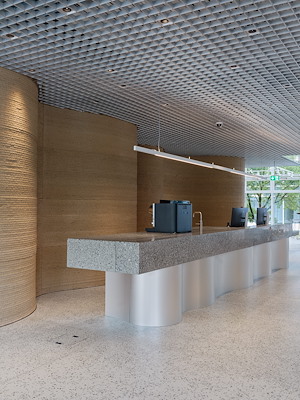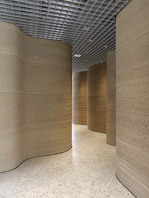 , de expositieruimtes en het vergadercentrum. Deze ruimtes zijn uitgevoerd in 3D-geprint beton en verschillende soorten spuitbeton. De vloer van de gehele begane grond is uitgevoerd als een terrazzovloer met gemalen gewapend beton als toeslagmateriaal.