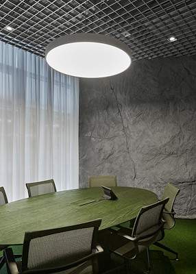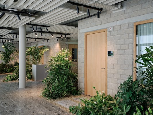 Alle kantoorvleugels zijn met elkaar verbonden door de ‘green lane’: een 180 meter lange groene ader die functioneert als verkeersroute, ontmoetingsplek, informele werkplek en entree van het kantoorgebied. Door zijn positie fungeert deze als een groene ‘resetzone’ tussen de verschillende delen van het gebouw. Doordat de planten in de computervloer zijn geplaatst in plaats van in opbouwbakken, voelt de begroeiing natuurlijker en meer geïntegreerd.