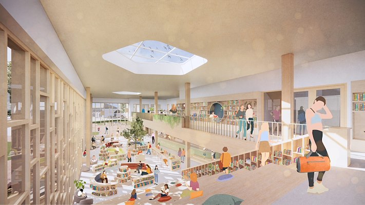 De bibliotheek bevindt zich in het hart van het gebouw en is zichtbaar van zowel de begane grond als de verdieping. Een brede tribunetrap verbindt de twee niveaus en vormt de plek waar kinderen een boek kunnen lezen en andere gebruikers een avondlezing of een concert kunnen bijwonen. Een andere belangrijke plek in het gebouw is het restaurant, dat direct naast de entree ligt. Bezoekers kunnen er een kop koffie drinken en voor sporters is het een plek om na de wedstrijd of training nog even te blijven hangen voor een drankje.