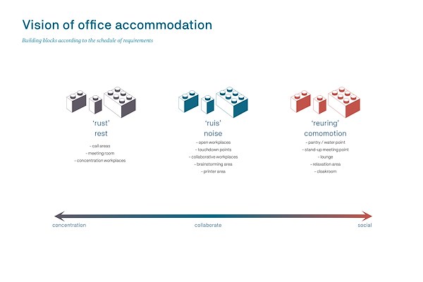 Bij het ontwerpen heeft Gortemaker Algra Feenstra de indeling van het kantoor zorgvuldig willen afstemmen op verschillende werkvormen en behoeften van het personeel. Daarbij zijn rust, interactie en reuring met elkaar in balans gebracht. De verschillende ruimtes moeten samenwerking gaan stimuleren, terwijl overzicht en plekken voor concentratie, wanneer nodig, beschikbaar blijven. Naast een aantal sociale zones voor overleg en interactie, zijn er dus andere plekken die geschikt zijn gemaakt voor focus en reflectie.