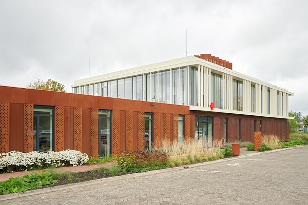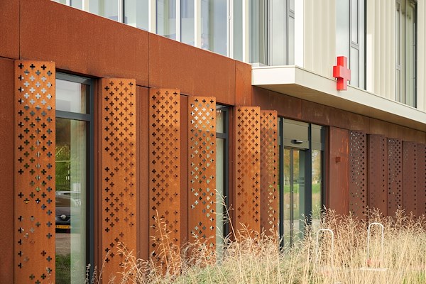 Afgelopen najaar is een nieuw gezondheidscentrum op de Johan Willem Frisokazerne in Assen in gebruik genomen. Een bestaand pand op het terrein is met behoud van fundering verbouwd tot een drie keer zo groot complex. Het kruis van Genève is als vorm van de plattegrond en als perforatie in de cortenstalen gevel gebruikt.
