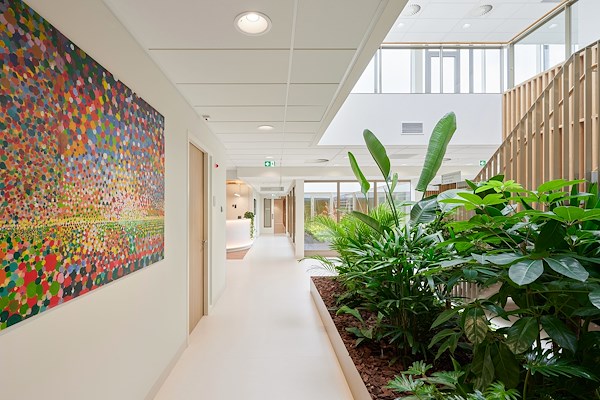 De hydrocultuurtuinen in het atrium en de patio creëren een groene en kalmerende atmosfeer, versterkt door het gebruik van natuurlijke materialen zoals hout en steen. Alle elementen samen vormen een ‘healing environment’ die herstel ondersteunt en tegelijk een prettige werkomgeving biedt voor zorgmedewerkers, meldt EGM.