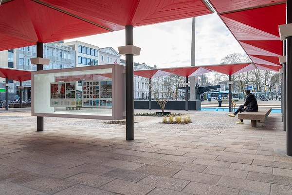 Het plein krijgt op termijn nieuwe bestrating, de nieuwe vloer is ingericht met een vormentaal die teruggrijpt op de Wederopbouwperiode. Het zijn lijnen, vlakken en punten die samen het grote vlak van de pleinvloer definiëren en kaderen, aldus opZoom Architecten.