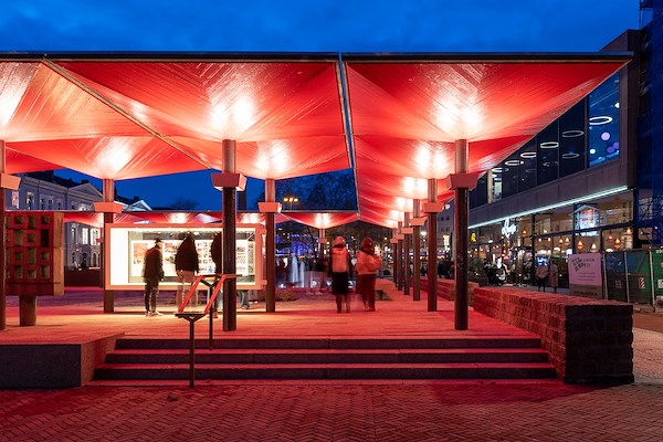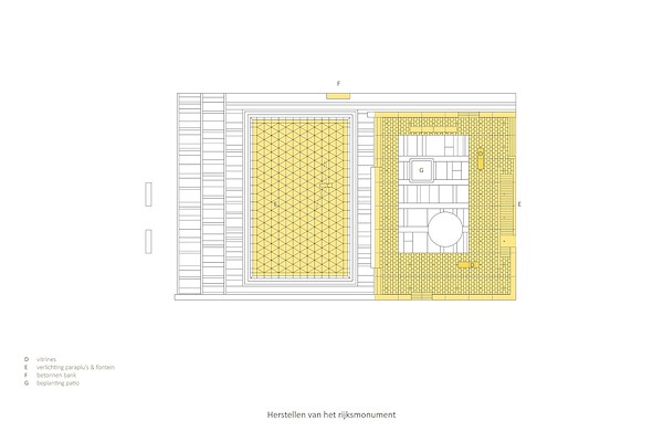 Bij de restauratie van het rijksmonument zijn verdwenen elementen teruggekeerd. De vitrines van de pergola hangen vrij tussen de stalen kolommen van de paraplu’s. De vitrines vormen een aanleiding de patio te programmeren en ontmoeting te stimuleren, meldt OpZoom. Ook is de verlichting van de paraplu’s hersteld, zodat het ensemble het hele jaar in de avondsituatie een prominente ontmoetingsplek kan vormen op het Gele Rijders Plein.