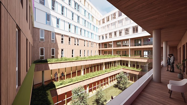 is ook oorspronkelijk ontworpen door LIAG, dat nu een vijfduizend vierkante meter omvattende vleugel toe gaat voegen aan het geheel. Het nieuwe volume is een verdieping lager dan de aanpalende researchvleugel, waarmee de oplopende lijn van het ziekenhuis wordt voltooid.