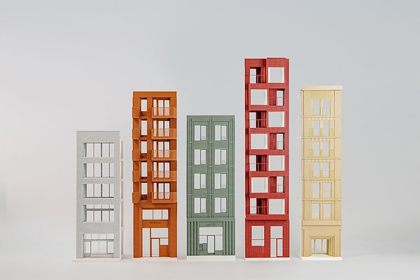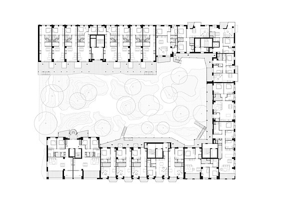 Het blok bestaat uit vijf verschillende volumes, met elk een eigen uitstraling, detaillering en oriëntatie op de straat en de bezonning. Bijzonder is het netwerk van ontsluitingen, die maakt dat de woningen zowel vanaf de straat als de binnentuin een eigen toegang hebben. Aan de ruim opgezette ontsluitingen wordt op het niveau van de binnentuin een collectief programma voor de bewoners gekoppeld, bestaande uit een een sportbar, een wasbar en een klusplek.