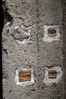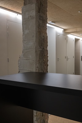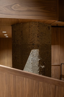 . Door meerdere verbouwingen is dit materiaal in de zaal uit het zicht verdwenen, onder meer door nieuwe bekleding van de kolommen en wanden. Bij de nu afgeronde renovatie is het oorspronkelijke bouwmateriaal juist weer zichtbaar gemaakt, evenals de ‘littekens’ die ontstonden door het verwijderen van het later aangebrachte materiaal.