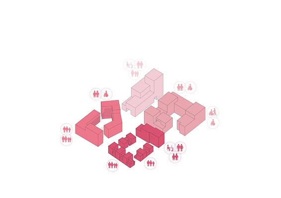 Woonwerk ontwierp daartoe vier gebouwen rondom een centraal plein dat fungeert als het sociale hart van het project. De gebouwen zijn met elkaar verbonden door bruggen en een doorlopende plint met gedeelde publieke functies. De plinten moeten uitnodigende, transparante ruimtes gaan worden die bewoners stimuleren om voorzieningen te gebruiken en elkaar te ontmoeten. De bruggen boven het straatniveau verbinden de verschillende collectieve ruimtes en dakterrassen binnen het complex. De plinten en bruggen moeten aan de samenhang binnen het ensemble gaan bijdragen.