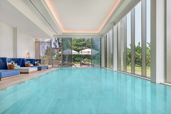 De gasten arriveren in een hoge lobby. Deze royale ruimte biedt eveneens zicht op het zwembad, de buitenbar en het groen aan de achterzijde van het hotel.