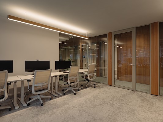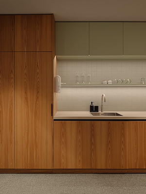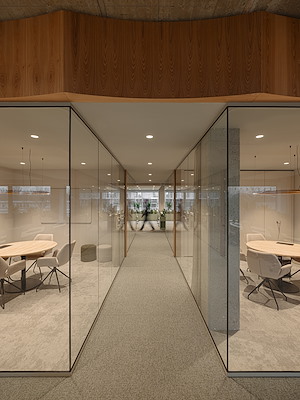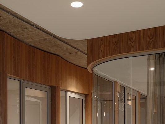 In het hart van het kantoor bevinden zich de vergader-, overlegruimtes en keuken, zodat ze letterlijk het middelpunt van de organisatie vormen. De ruimtes zijn vormgegeven als een samenhangend volume, opgebouwd uit gewelfde panelen van iepenhout. De organische lijnen versterken volgens Bureau Fraai het natuurlijke karakter van het interieur en dragen bij aan een menselijke schaal binnen de ruimte. Tegelijkertijd zorgen de afgeronde vormen voor een prettige akoestiek en een uitnodigende uitstraling, passend bij een moderne, mensgerichte werkomgeving, aldus het bureau.