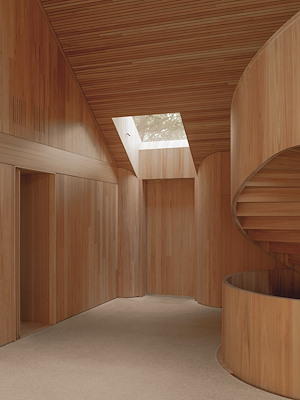 Deze constructie vormt de basis voor een samenhangend houten interieur, dat is opgevat als één doorlopend systeem. Wanden, plafonds, vaste meubelonderdelen en kozijnen zijn uitgevoerd in Red Grandis-hout. Installaties zijn integraal onderdeel van het ontwerp: ventilatiesleuven zijn direct in het hout gefreesd en blijven zichtbaar als onderdeel van de architectuur. Gebogen wanden en lange zichtlijnen zorgen voor ruimtelijke samenhang en doorstroming.