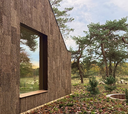 vond het antwoord bij een kantoor op de Blaricumse heide in de typologie van een plaggenhut. Met een gevel van populierenbast en een met heide begroeid dak wordt het landschap als het ware doorgetrokken over het gebouw.