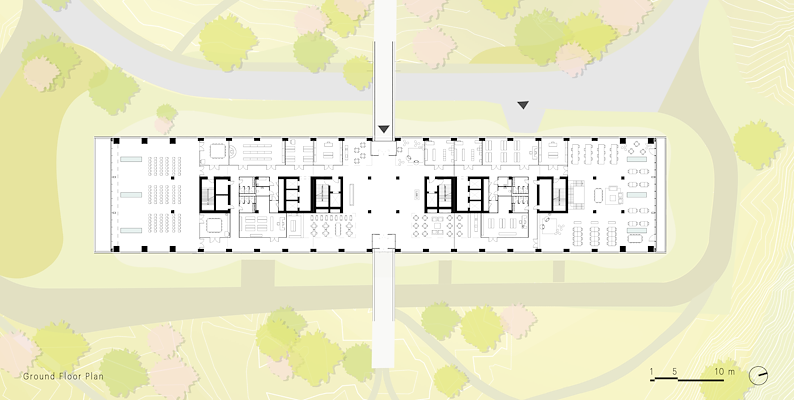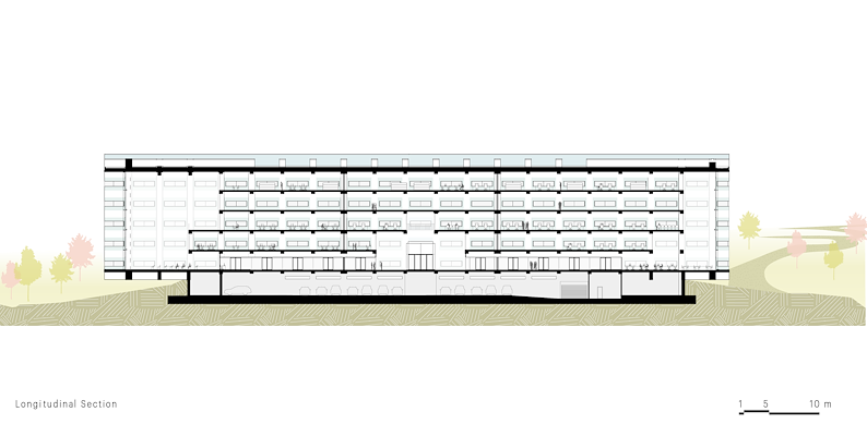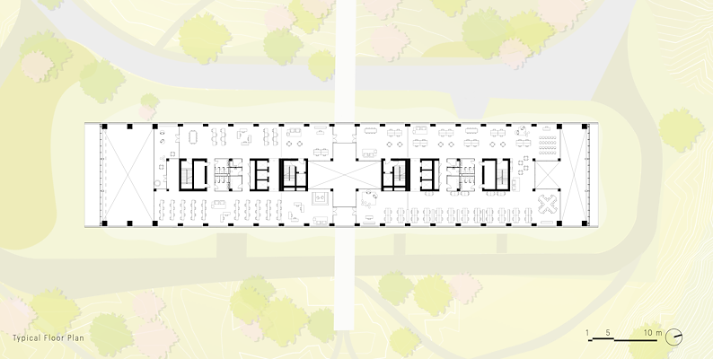 In het midden vormt de āGrottoā de hoofdentree langs de centrale as, hier zijn ook cafĆ© en lounge beoogd. Aan de zuidzijde strekt de āValleyā zich uit over de volledige hoogte van het gebouw en biedt plek aan een flexibel te gebruiken evenementenruimte. Aan de noordzijde zorgt de āCanyonā voor verticale verbindingen tussen de verdiepingen en faciliteert het samenwerken op verschillende niveaus. Door de atria dringt daglicht ook tot diep in het gebouw door. De gevel van polycarbonaat laat overdag licht door en moet het gebouw ās avonds zacht laten oplichten.