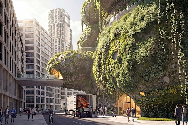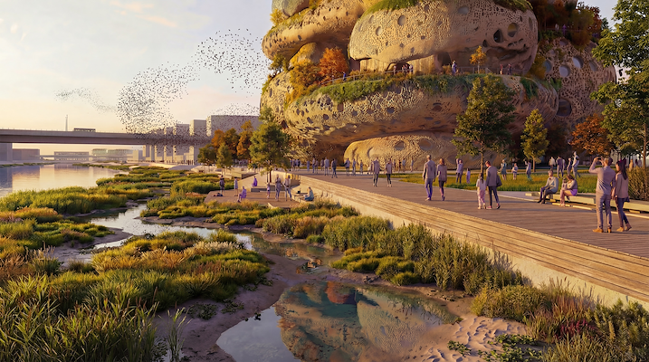 : Een verzameling poreuze, levende rotsen die Rotterdam’s nieuwe landmark verbeelden via ecologie en beleving.